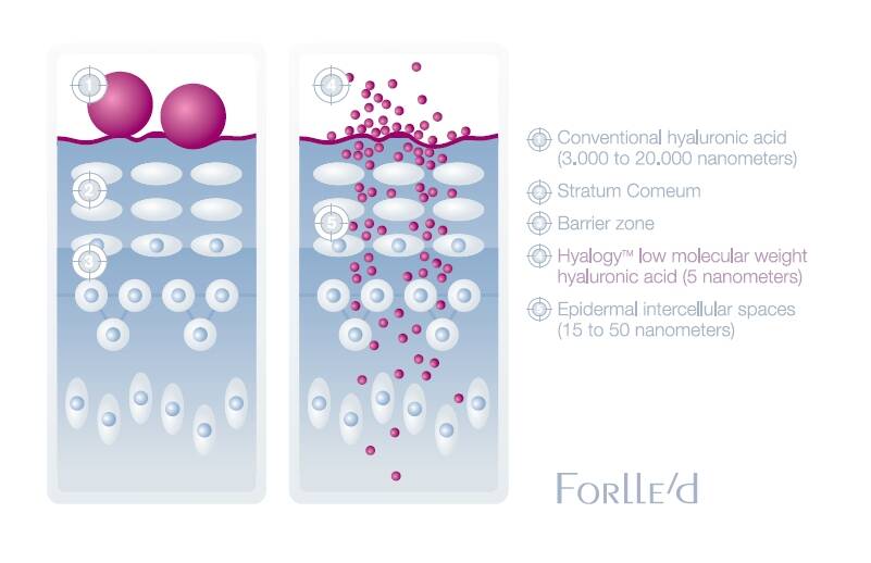 Den lavmolekylære hyaloronsyre er kun på 15 op til 50 nanometer, det betyder, at cremen er i stand til at trænge hurtigere og endnu dybere ned i din hud, dermed kommer effekten af produkterne indefra de underliggende lag i huden.