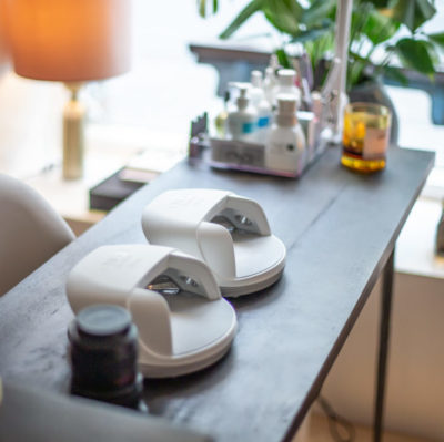 Herefter påføres CND Shellac. Det unikke ved behandlingen er, at den tørrer i UV-lys og derfor er helt tør efter behandlingen.